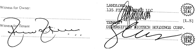 Agreement of Lease, made as of July 1 in the year 2006 between 135 FIFTH AVENUE LLC, having an office at 441 Lexington Ave., 10th F1, New York, NY party of the first part, hereinafter referred to as OWNER or Landlord, and DIVERSIFIED BIOTECH HOLDINGS CORP. having an office at party of the second part, hereinafter referred to as TENANT.