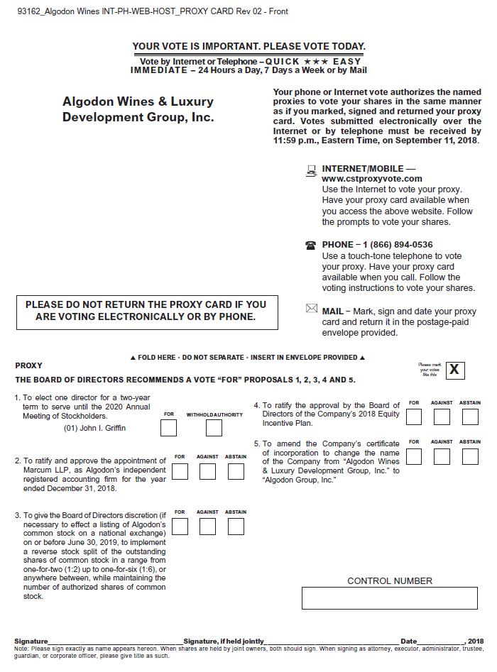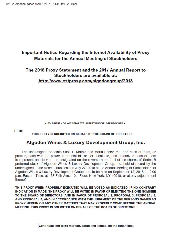 You are cordially invited to attend the Annual Meeting of Stockholders of Algodon Wines & Luxury Development Group, Inc. (“Algodon”) on September 12, 2018, at 2:00 p.m. Eastern Time, at 135 Fifth Ave., 10th Floor, New York, NY 10010 (the “Annual Meeting”). At the Annual Meeting the Company will submit the following five (5) proposals to its stockholders for approval: