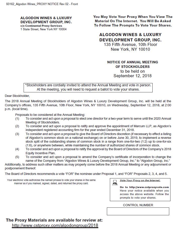 The Annual Meeting is being held for the purposes set forth in the accompanying Notice of Annual Meeting of Stockholders. This Proxy Statement (including the Notice of Annual Meeting of Stockholders) is first being made available to stockholders beginning on or about August 3, 2018. The Company’s Annual Report on Form 10-K for the fiscal year ended December 31, 2017, including financial statements (“Annual Report”), was filed with the Securities and Exchange Commission (the “SEC”) on March 30, 2018, and the Company’s quarterly report on Form 10-Q for the fiscal quarter ended March 31, 2018 including financial statements (“Quarterly Report”), was filed with the SEC on May 15, 2018. Hard copies of this Proxy Statement and the Annual Report will be provided to record holders of common stock (who are receiving proxy materials via the Notice and Access Method) via U.S. mail only by request and the Quarterly Report is available on the internet at: http://www.cstproxy.com/algodongroup/2018.