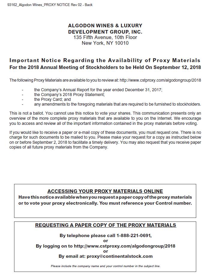 We are furnishing this Proxy Statement to stockholders of ALGODON WINES & LUXURY DEVELOPMENT GROUP, INC. (“We” or “Algodon” or the “Company”) in connection with the Annual Meeting of Stockholders (the “Annual Meeting”) and at any adjournments or postponements thereof. We will hold the Annual Meeting on September 12, 2018, at 2:00 p.m. Eastern Time, at 135 Fifth Ave., 10th Floor, New York, NY 10010.