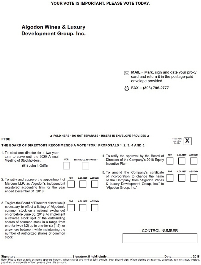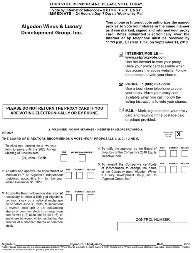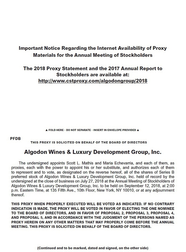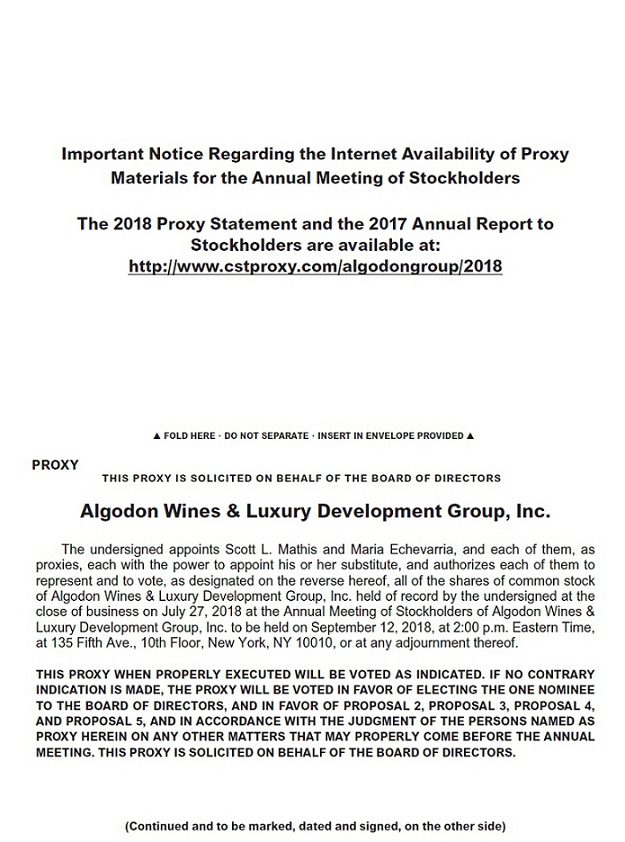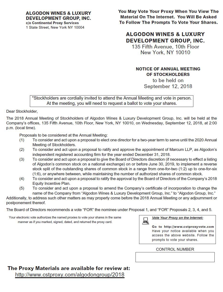 You are cordially invited to attend the Annual Meeting of Stockholders of Algodon Wines & Luxury Development Group, Inc. (“Algodon”) on September 12, 2018, at 2:00 p.m. Eastern Time, at 135 Fifth Ave., 10th Floor, New York, NY 10010 (the “Annual Meeting”). At the Annual Meeting the Company will submit the following five (5) proposals to its stockholders for approval: