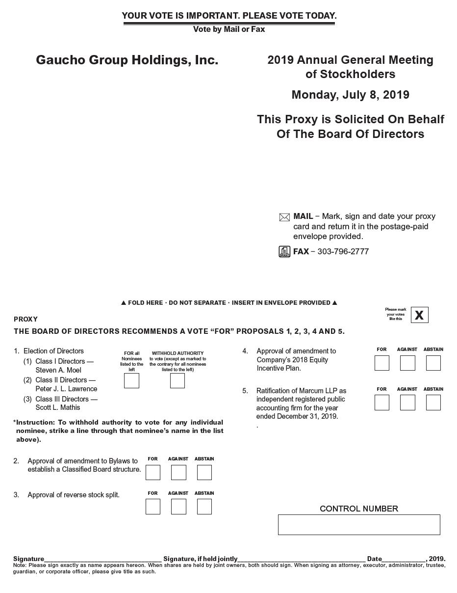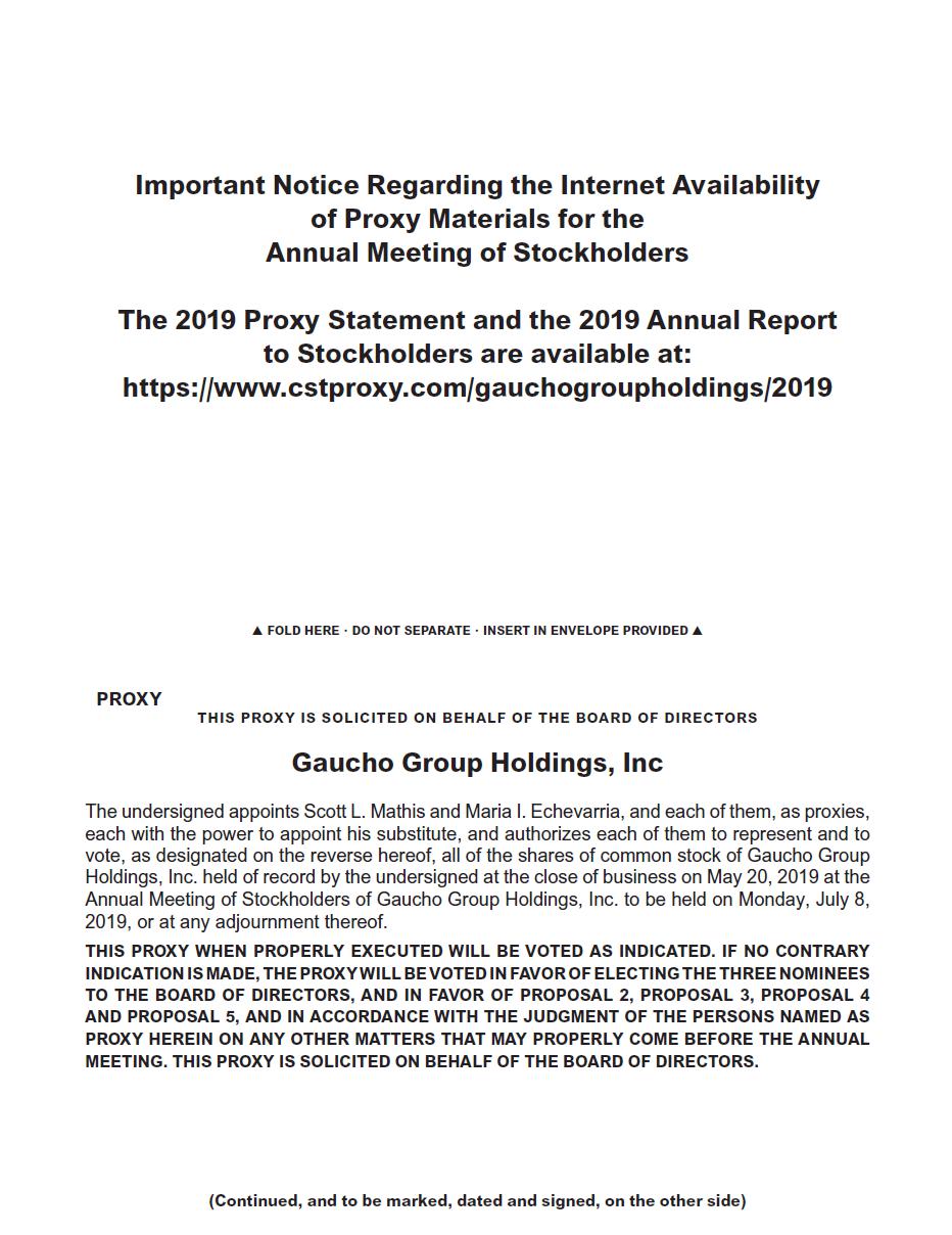 You are receiving this letter and the accompanying proxy card from Gaucho Group Holdings, Inc. (the “Company”) because you are a stockholder of the Company entitled to vote at the Company’s annual meeting. The Company will be hosting its annual meeting of stockholders on July 8, 2019, at 2:00 p.m. (local time) at 135 Fifth Avenue, 10th Floor, New York, NY 10010.