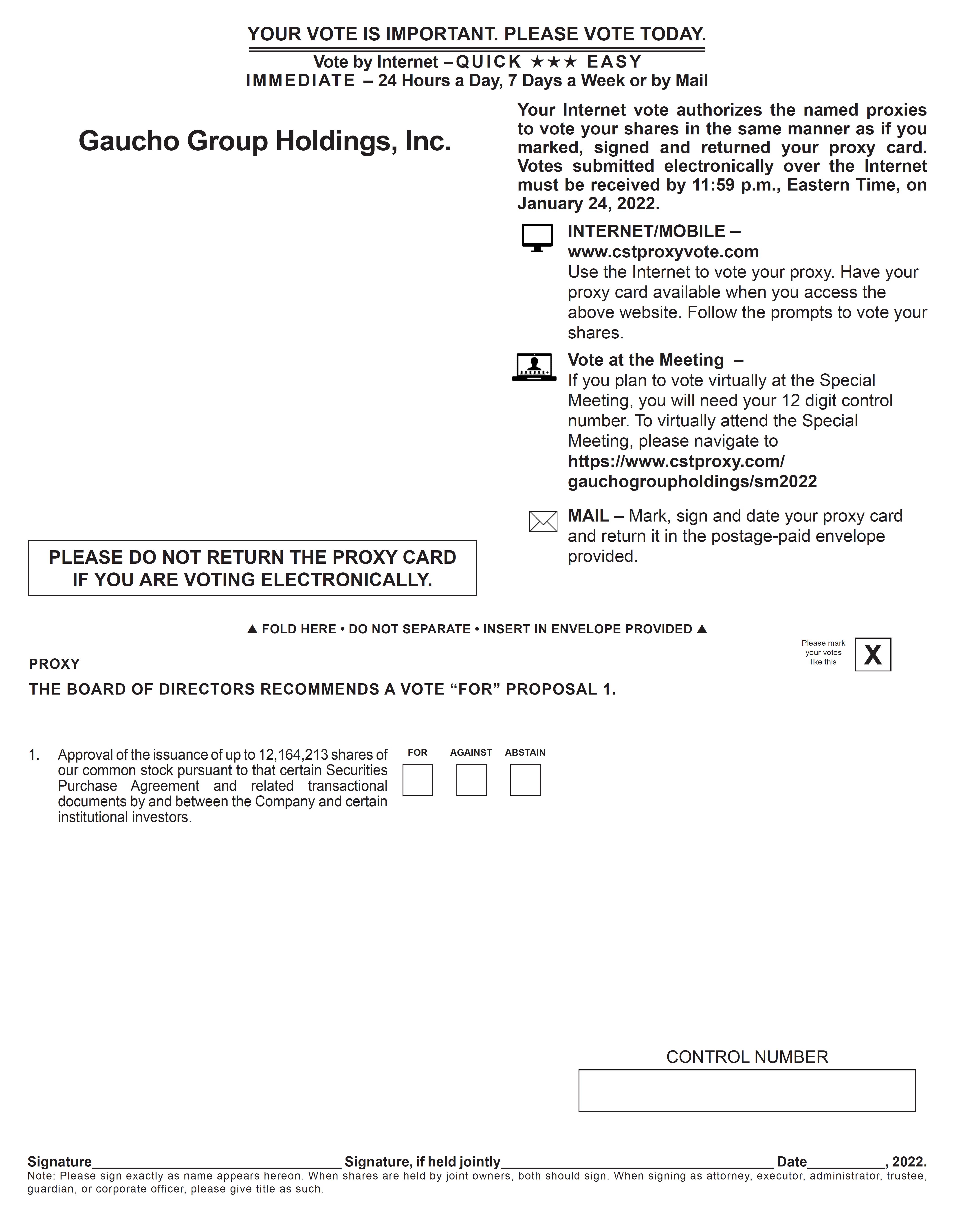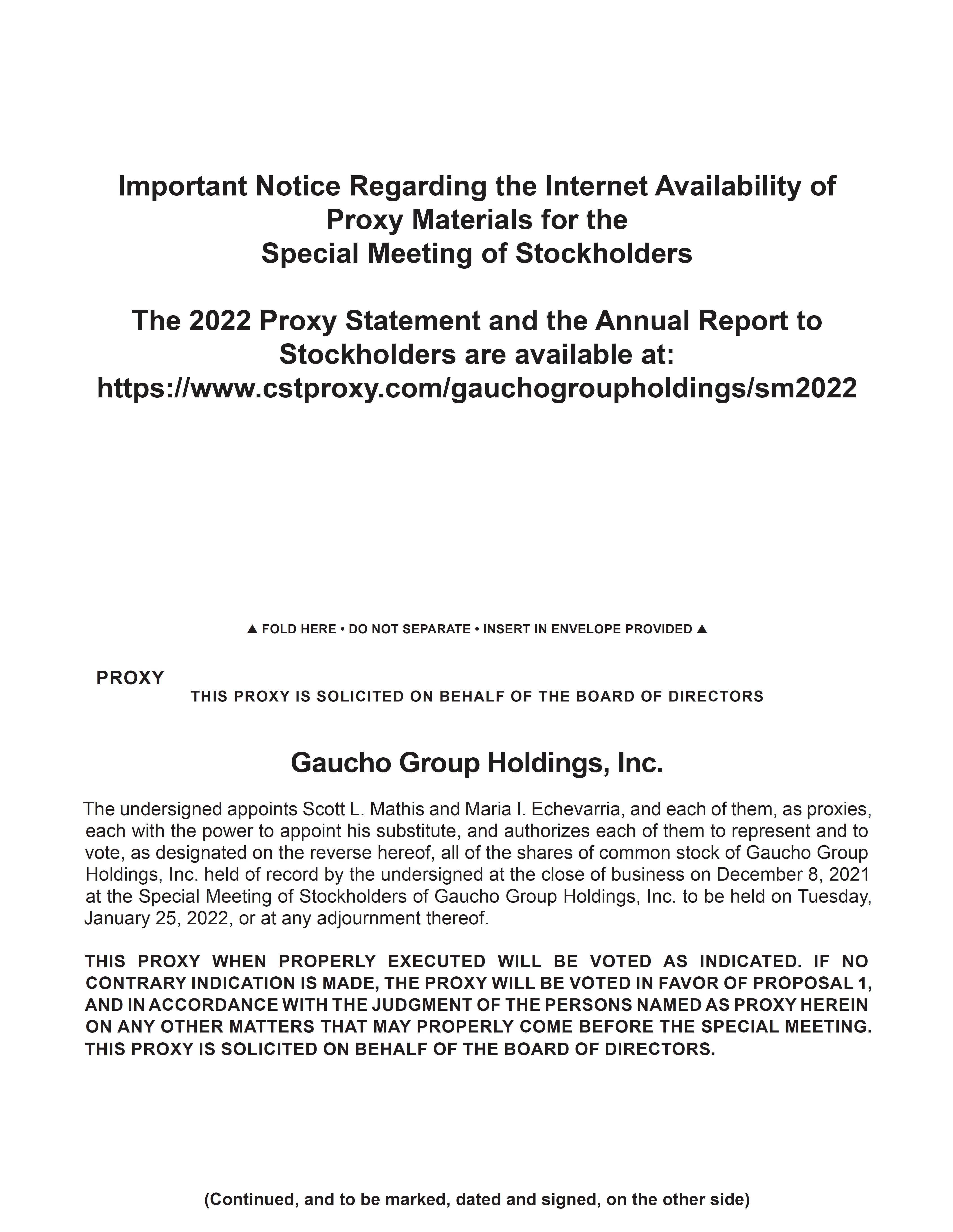 You are cordially invited to attend the Special Meeting of Stockholders of Gaucho Group Holdings, Inc. (the “Company”, or “GGH”) on January 25, 2022, at 12:00 p.m. Eastern Time, via webcast at https://www.cstproxy.com/gauchogroupholdings/sm2022, (the “Special Meeting”). At the Special Meeting the Company will submit the following proposal to its stockholders for approval: