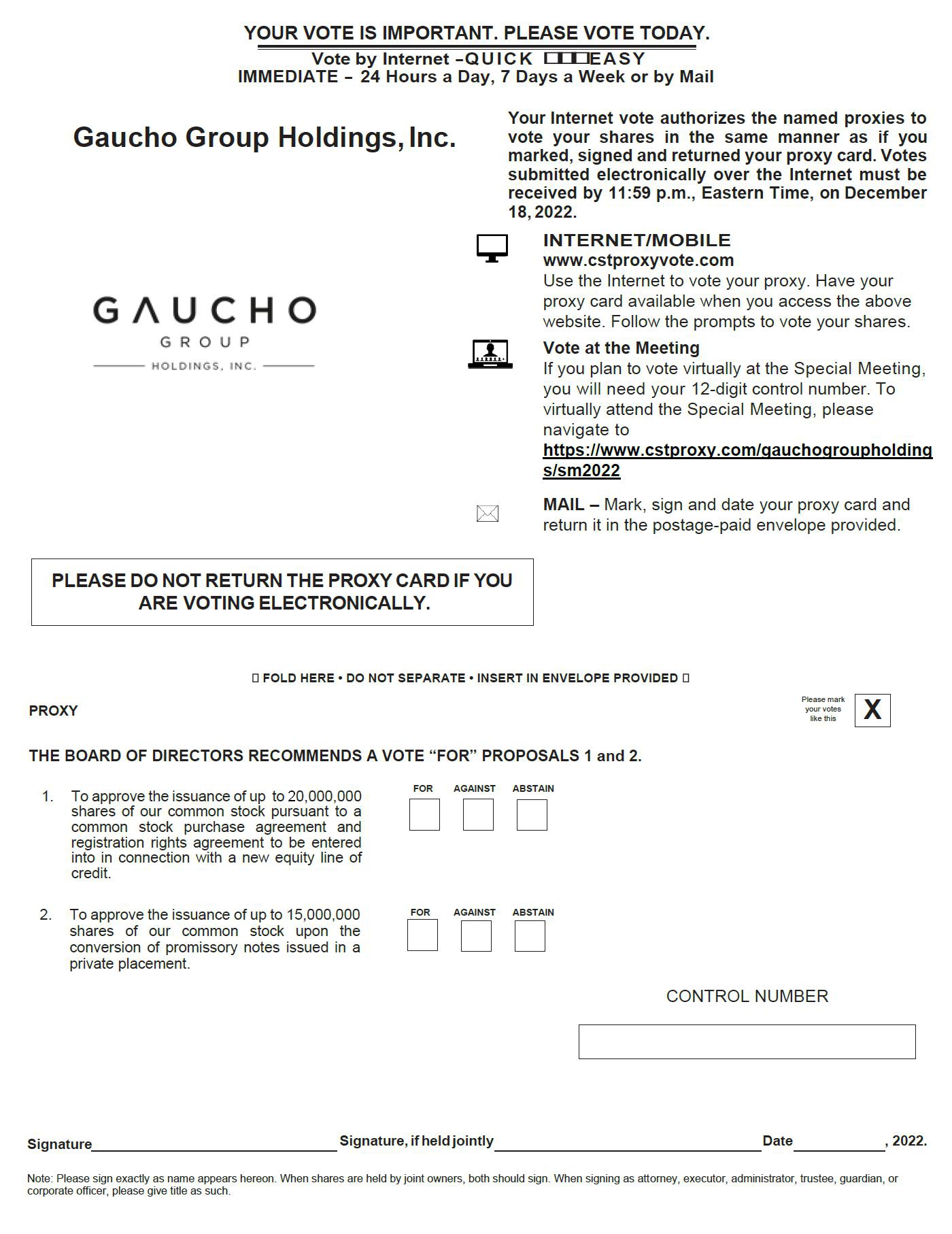 You are cordially invited to virtually attend the Special Meeting of Stockholders of Gaucho Group Holdings, Inc. (the “Company”, or “GGH”) on December 19, 2022, at 12:00 p.m. Eastern Time, via webcast at https://www.cstproxy.com/gauchogroupholdings/sm2022 (the “Special Meeting”). At the Special Meeting the Company will submit the following two (2) proposals to its stockholders for approval: