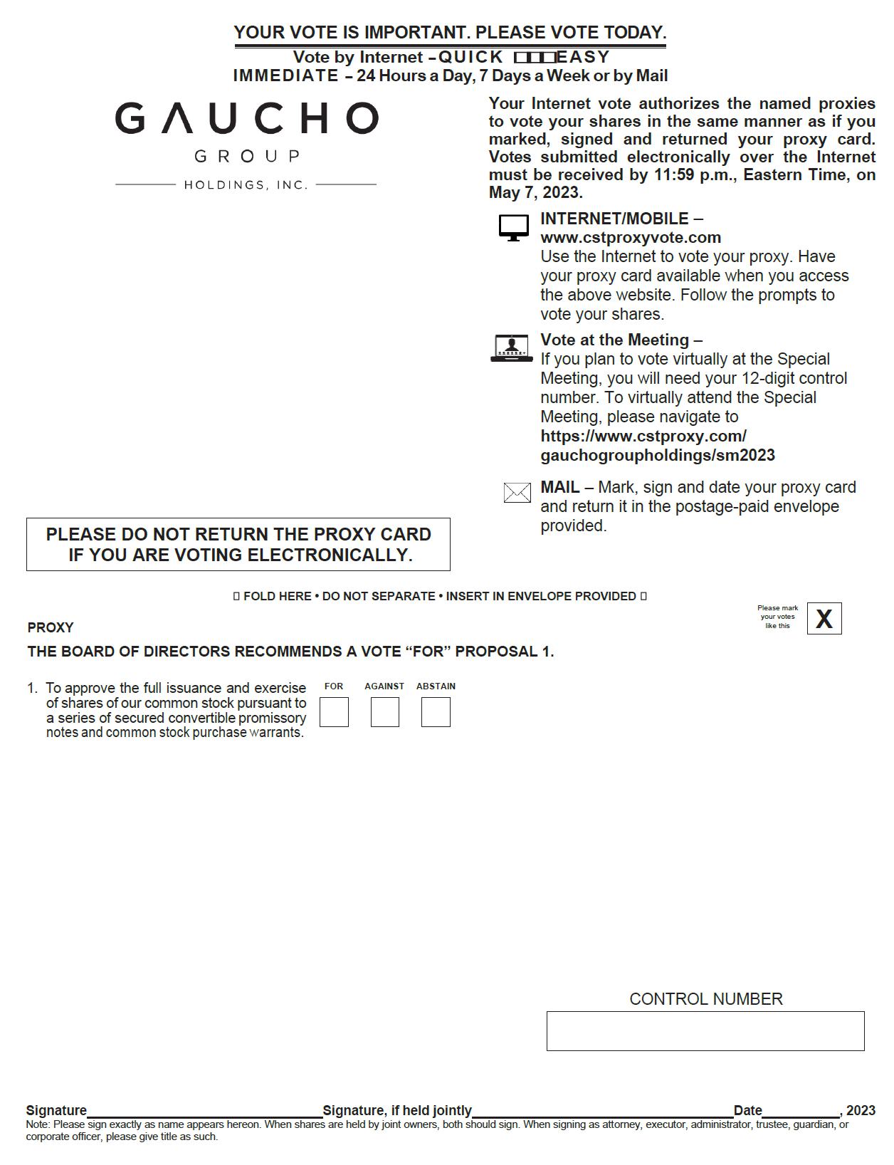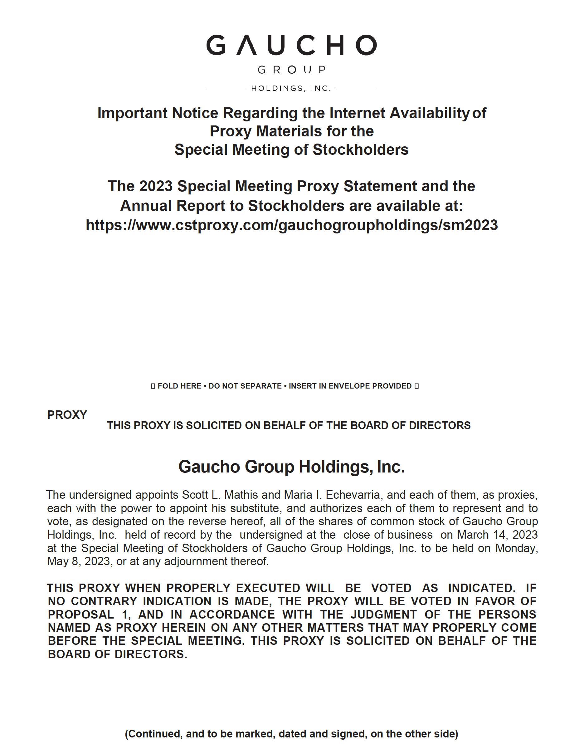 You are cordially invited to virtually attend the Special Meeting of Stockholders of Gaucho Group Holdings, Inc. (the “Company”, or “GGH”) on May 8, 2023, at 12:00 p.m. Eastern Time, via webcast at https://www.cstproxy.com/gauchogroupholdings/sm2023 (the “Special Meeting”). At the Special Meeting the Company will submit the following proposal to its stockholders for approval: