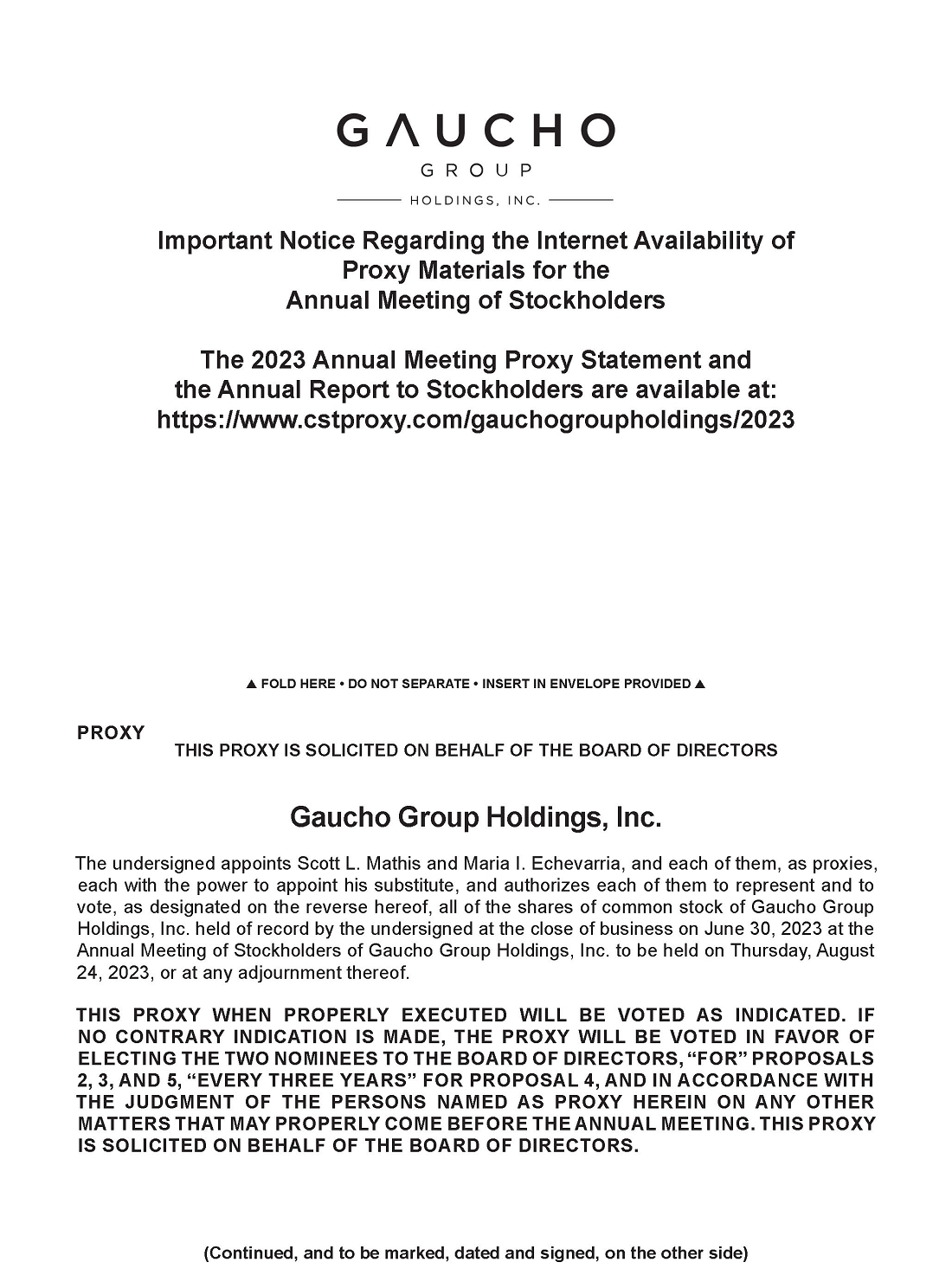 The Annual Meeting is being held for the purposes set forth in the accompanying Notice of Annual Meeting of Stockholders. This Proxy Statement (including the Notice of Annual Meeting of Stockholders) is first being made available to stockholders beginning on or about July 14, 2023. The Company’s Annual Report on Form 10-K for the fiscal year ended December 31, 2022, including financial statements (“Annual Report”), was filed with the Securities and Exchange Commission (the “SEC”) on April 17, 2023. The Company’s quarterly report on Form 10-Q for the fiscal quarter ended March 31, 2023, including financial statements (“Quarterly Report”), was filed with the SEC on May 19, 2023. Hard copies of this Proxy Statement, the Annual Report, and the Quarterly Report will be provided to record holders of common stock (who are receiving proxy materials via the Notice and Access Method) via U.S. mail only by request and are available on the internet at: https://www.cstproxy.com/gauchogroupholdings/2023.