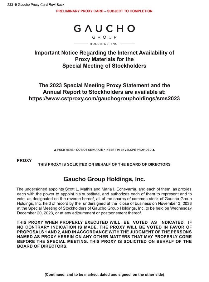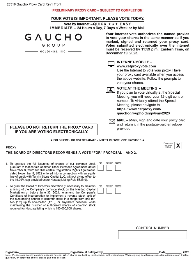 You are cordially invited to virtually attend the Special Meeting of Stockholders of Gaucho Group Holdings, Inc. (the “Company”, or “GGH”) on December 20, 2023, at 12:00 p.m. Eastern Time, via webcast at https://www.cstproxy.com/gauchogroupholdings/sms2023 (the “Special Meeting”). At the Special Meeting the Company will submit the following two proposals to its stockholders for approval: