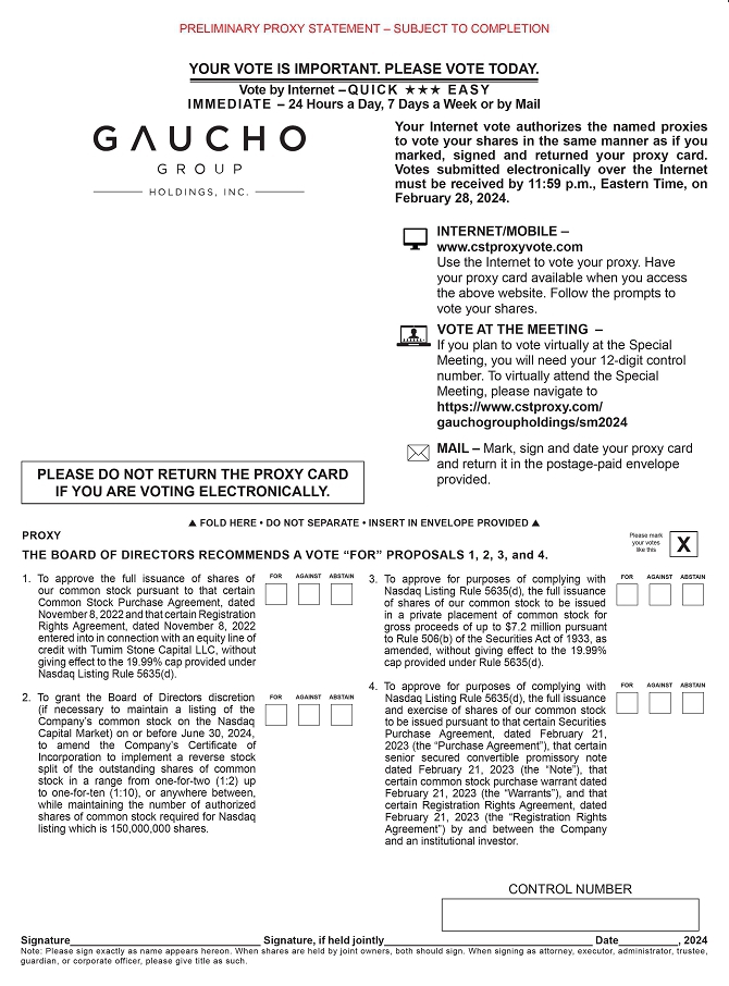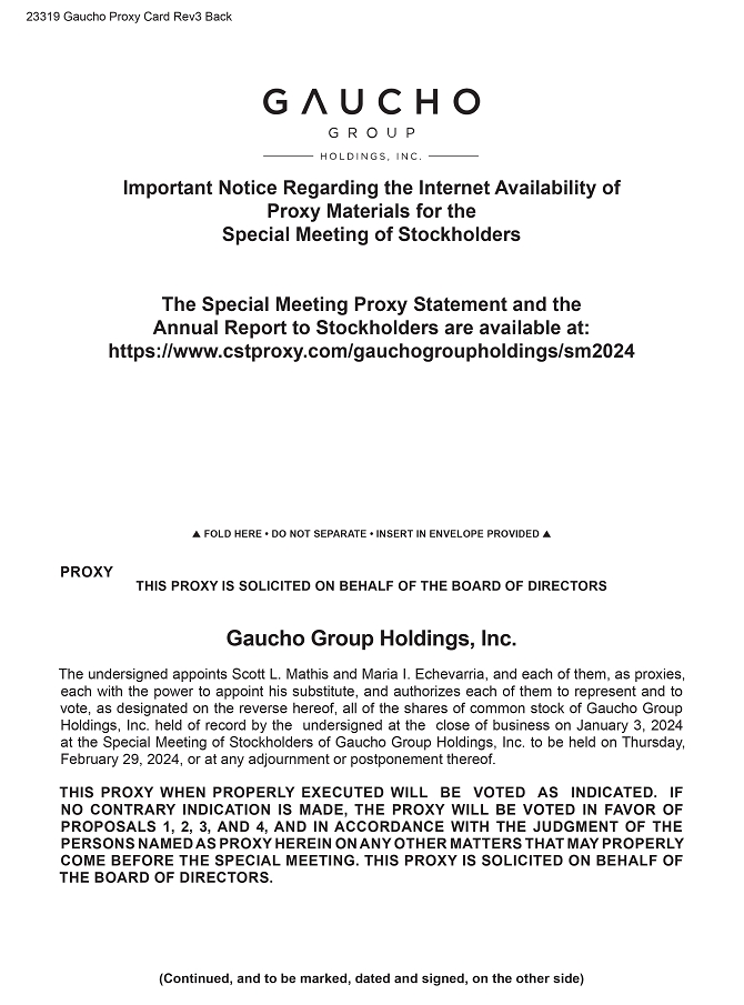 You are cordially invited to virtually attend the postponed Special Meeting of Stockholders of Gaucho Group Holdings, Inc. (the “Company”, or “GGH”) on February 29, 2024, at 12:00 p.m. Eastern Time, via webcast at https://www.cstproxy.com/gauchogroupholdings/sm2024 (the “Special Meeting”). At the Special Meeting the Company will submit the following four proposals to its stockholders for approval: