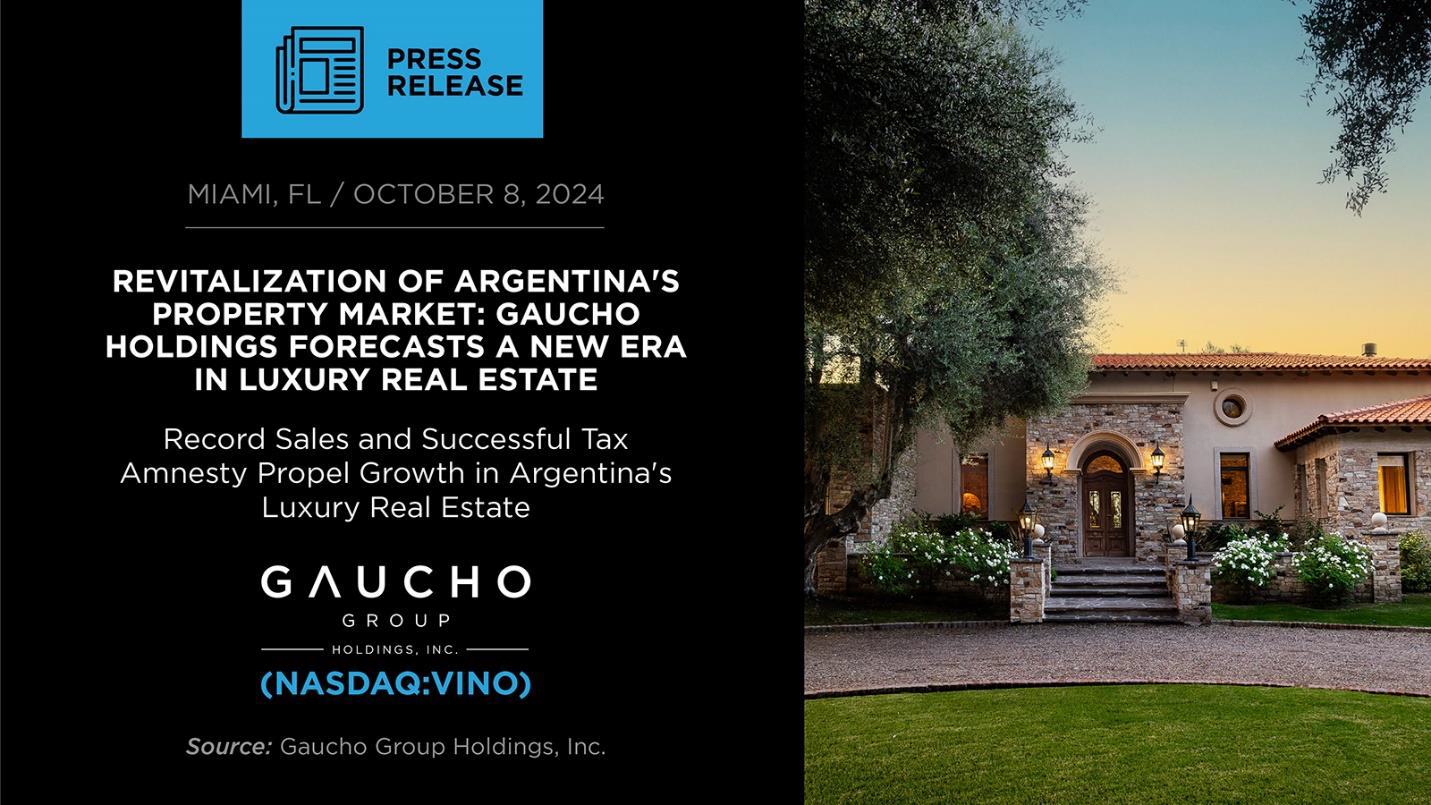 MIAMI, FL / October 8, 2024 / Gaucho Group Holdings, Inc. (NASDAQ:VINO), a company that includes a growing collection of e-commerce platforms with a concentration on fine wines, luxury real estate, and leather goods and accessories (the “Company” or “Gaucho Holdings”), today reported substantial growth and favorable trends in the Buenos Aires real estate market, underscoring the market’s recovery and the Company’s strategic positioning in Argentina’s burgeoning luxury real estate sector. Drawing on internal expertise and recent market data, Gaucho Holdings underscores a pivotal shift in the market dynamics of Argentina’s capital.