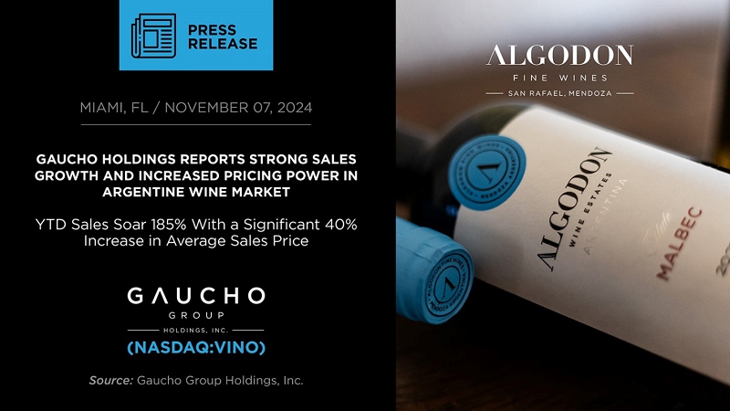 MIAMI, FL / November 07, 2024 / Gaucho Group Holdings, Inc. (NASDAQ:VINO), a company that includes a growing collection of e-commerce platforms with a concentration on fine wines, luxury real estate, and leather goods and accessories (the “Company” or “Gaucho Holdings”), today announced a significant milestone in its wine sales performance. For the year to date in 2024, the Company’s sales have increased by 185% compared to the same period in 2023, coupled with an impressive 40% increase in the average sales price per bottle.