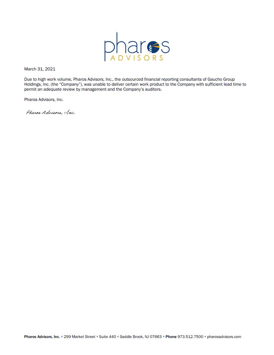 Gaucho Group Holdings, Inc. (the “Company”) has determined that it is unable to file its Annual Report on Form 10-K for the year ended December 30, 2020 by March 31, 2021, the due date for such filing because the Company’s consolidated financial statements for the year ended December 31, 2020 have not been finalized. The delay in completing the financial statements is attributable to delays in obtaining data from our outsourced financial reporting consultants.